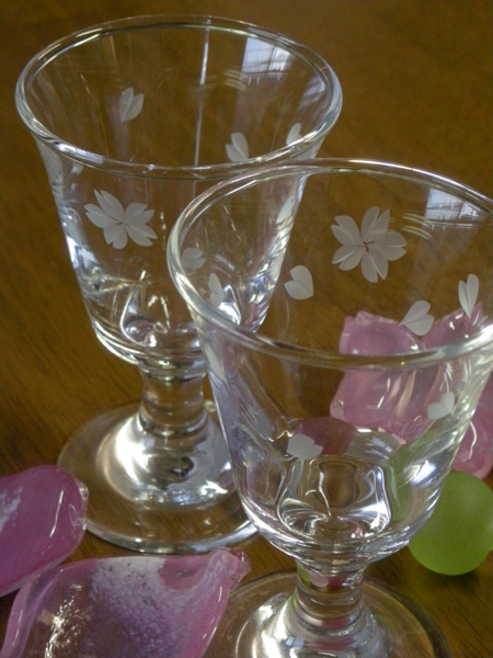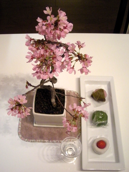 桜の鉢植えでお花見 桜の箸置きと日本酒グラス